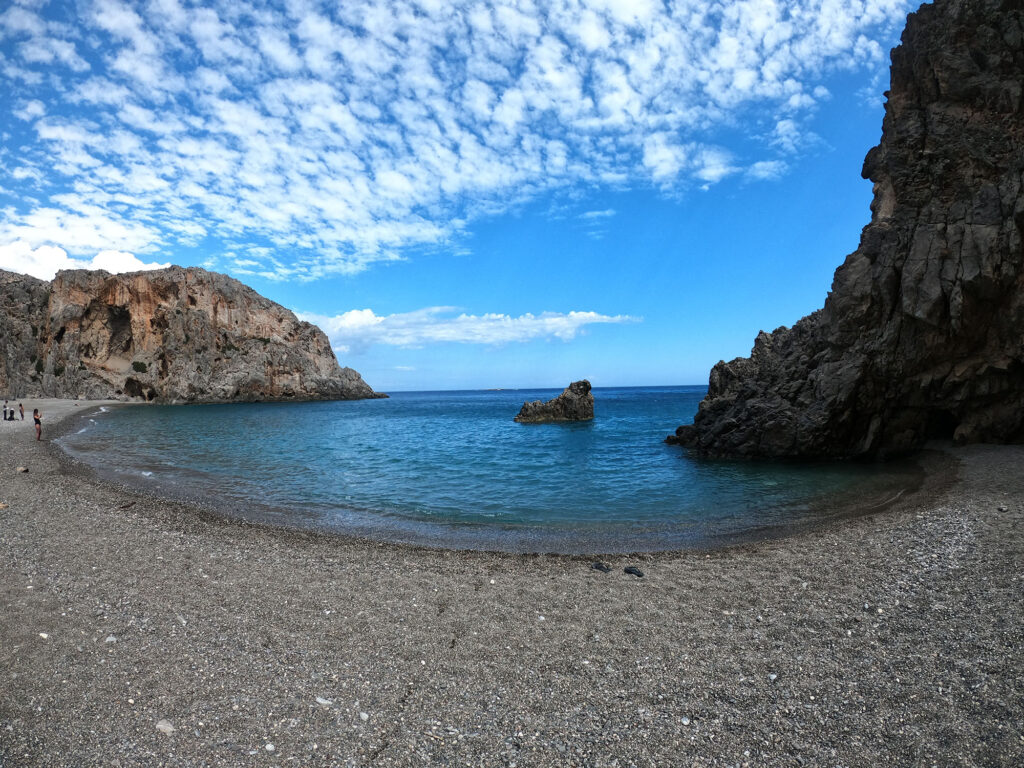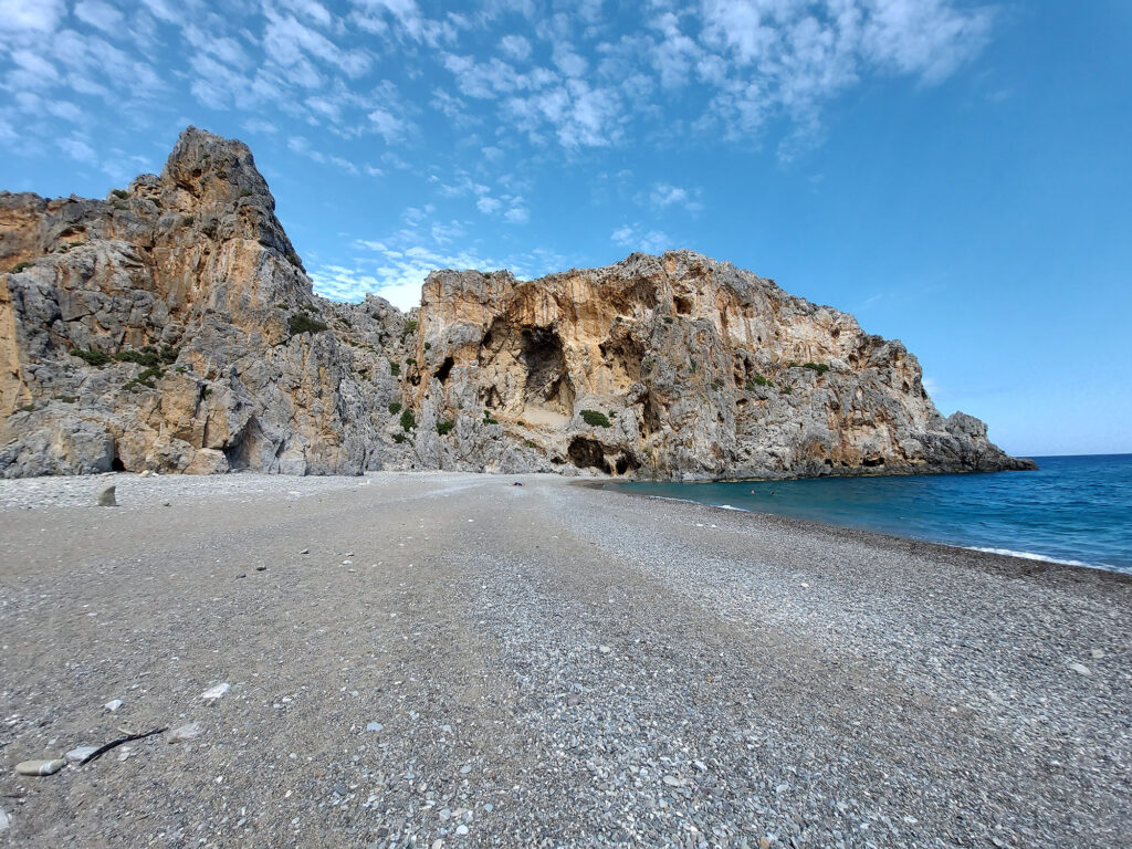At the end of the eponymous canyon, which the hiking trail winds through, is Agiofarago Beach. “Canyon of the Saints” is what Agiofarago means. Hermits used to come to the canyon to practice asceticism. This is where 300 saints are said to have resided. They were each in their own cell, separated from one another all the time.