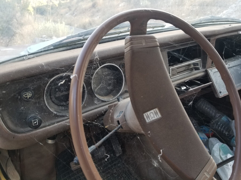 The interior of the car is all covered in spider webs and we couldn’t determine which brand it is.