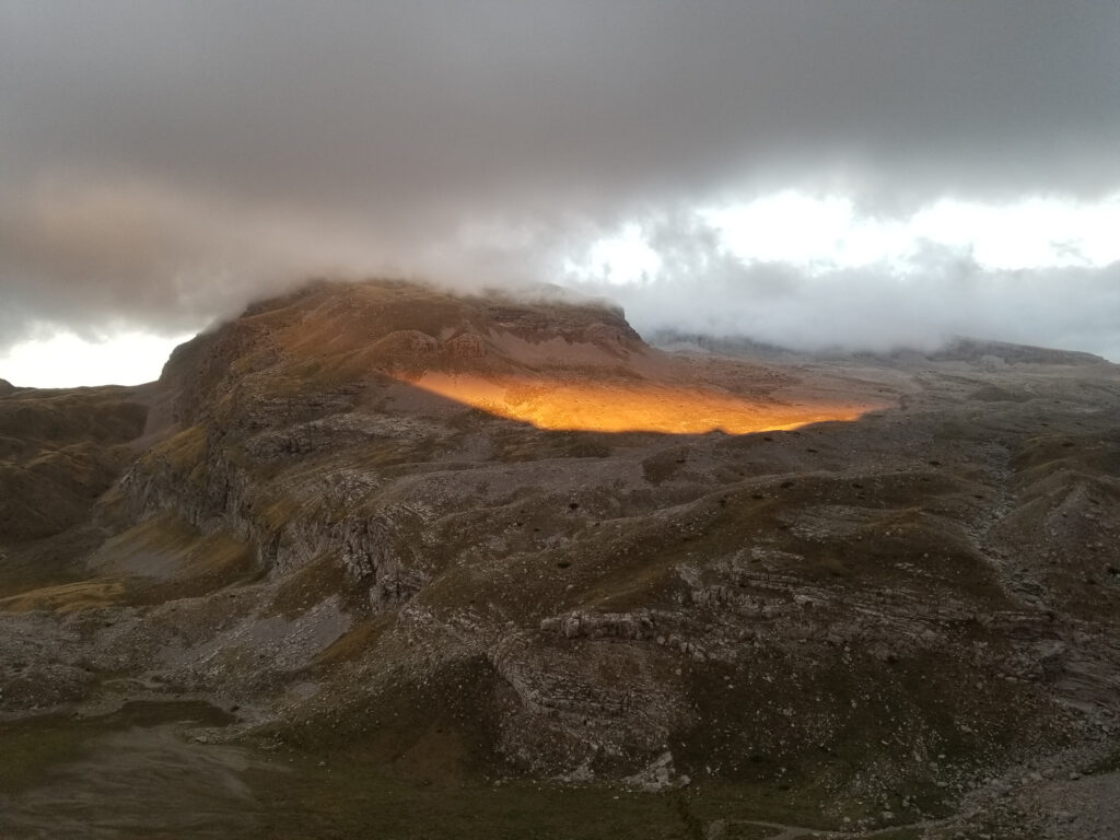 In a moment, an extraordinary sight appeared in front of us. The sunlight passed through a hole in the cloud and illuminated a part of the mountain. The light was so bright in that place, that the illusion was created as if we were above a volcano.