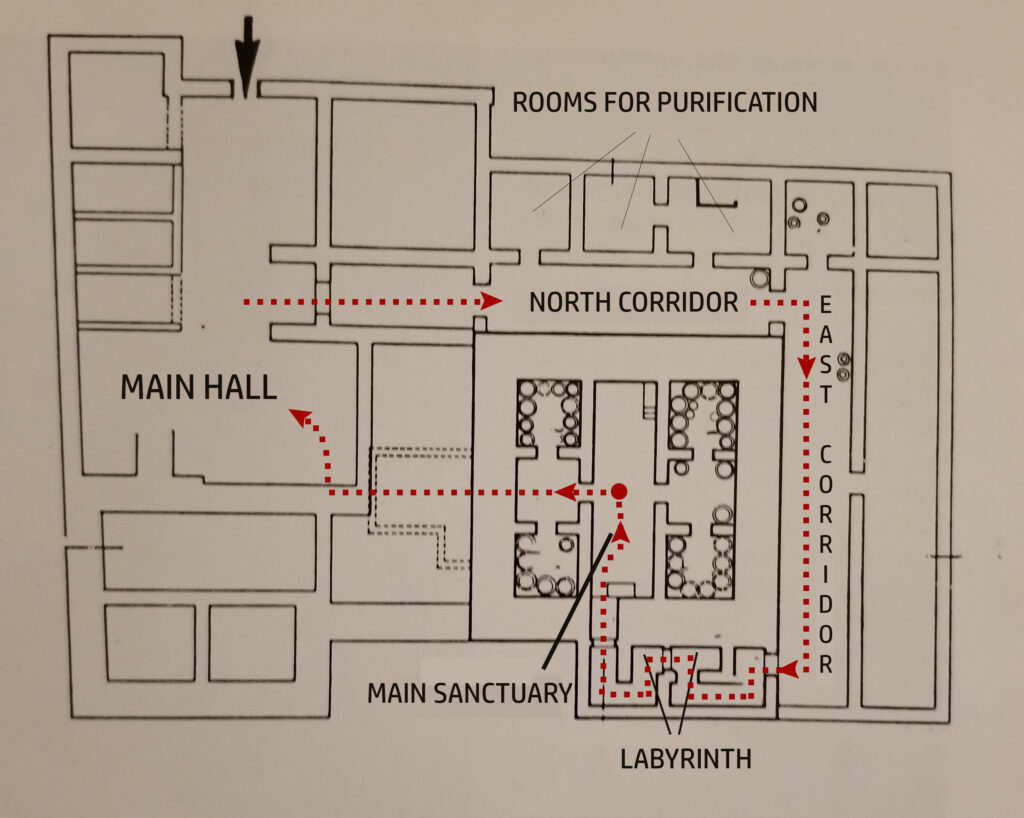 From the eastern corridor, the ceremony would enter the southern corridor, the so-called a labyrinth, which would create the illusion of moving through the dark and winding streets of Hades. The labyrinth had three iron doors, which were believed to exist in Hades as well.